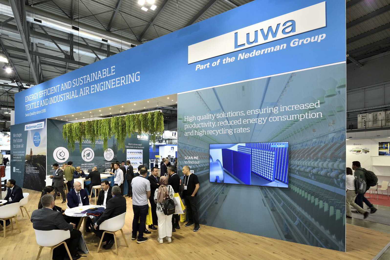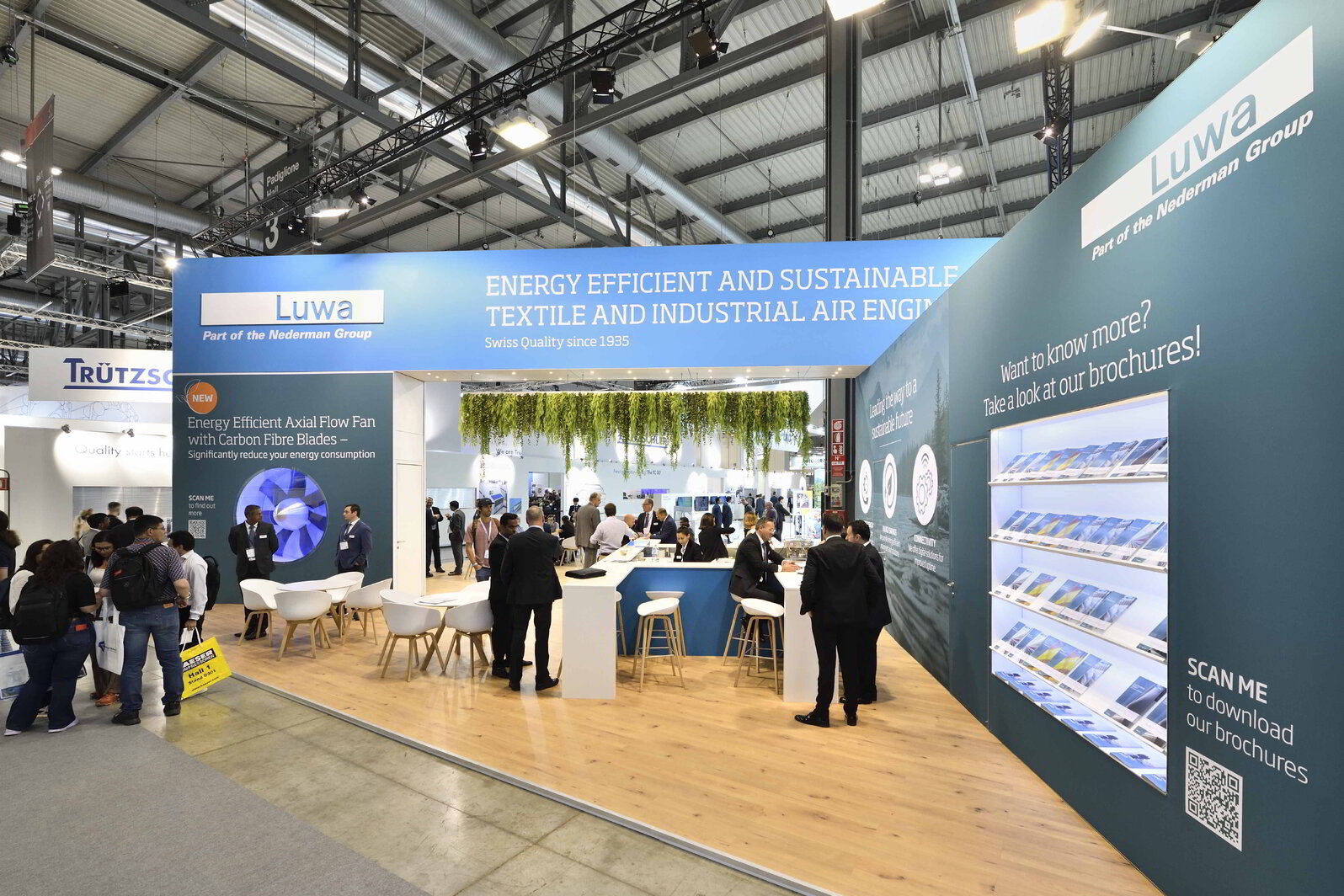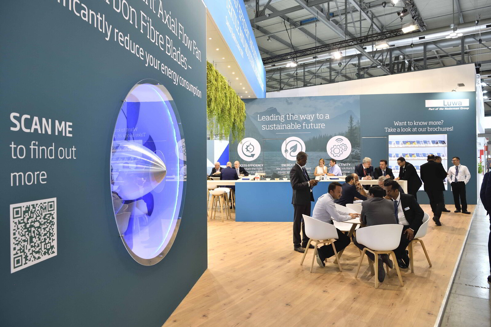 Frischer WindUnter der Leitidee "Nachhaltigkeit" präsentiert sich Luwa Air Engineering besonders auffallend und vielfältig. Mit dem herabgesetzten Pflanzendach erschufen wir eine natürliche und belebte Atmosphäre für persönliche Begegnungen. Dabei war es unseren Stilberatern wichtigen einen Eyecatcher-Moment zu erschaffen, welcher von Weitem ins Auge stach. Bei Ihrem Auftritt setze Luwa gezielt nur das Produkte "Axial Flow Fan" ein, welchen wir elegant und originell in Szene setzten. Mit seiner Grösser brachte der Ventilator mit jeder Umdrehung frischen und innovativen Wind auf die Fläche. Ein gelungenes Standkonzept welches sämtliche Besucher begeisterte!